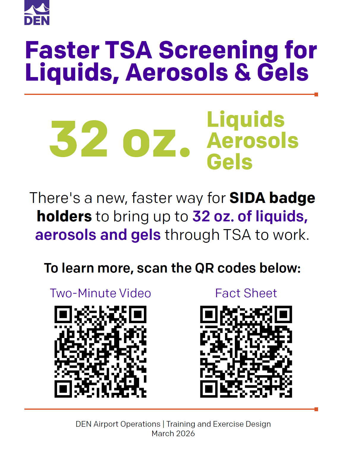 The below flyer is the new, faster process that allows SIDA badge holders to bring daily-use liquids, aerosols, and gels to work through TSA screening. The QR codes link to a brief informational video explaining the change, as well as an electronic fact sheet.